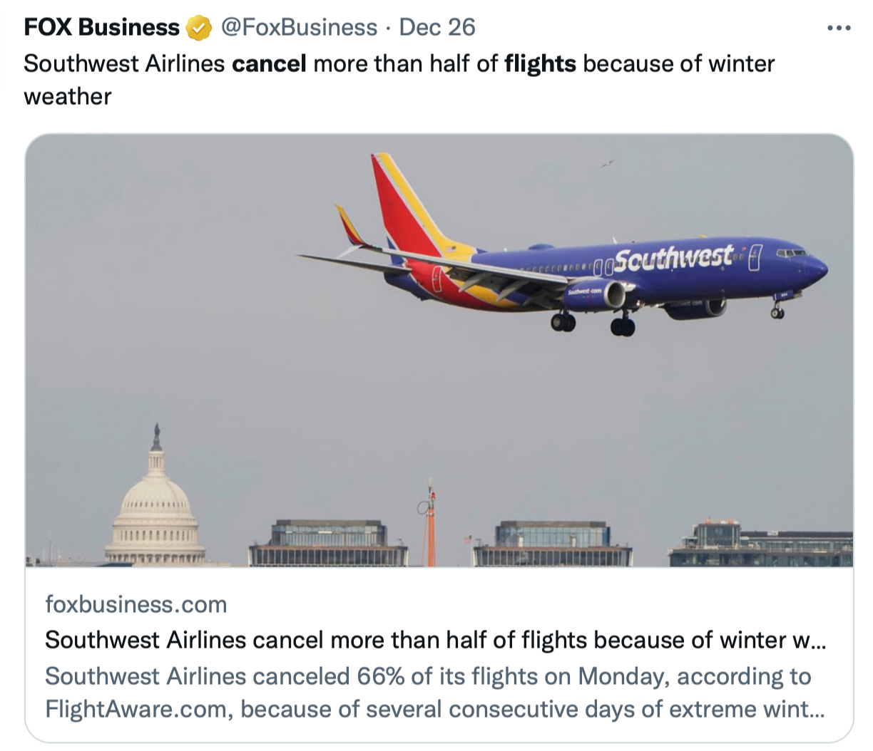 According to Bloomberg, the bigoted bad weather primarily aimed at Southwest Airlines, for some reason.