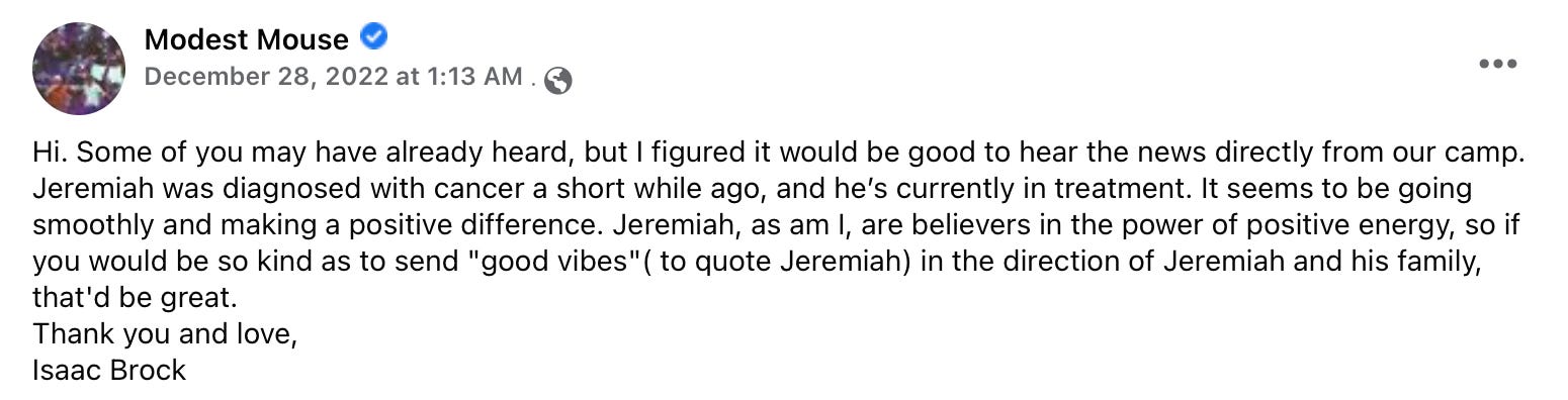 On December 28th, Modest Mouse’s lead singer Isaac Brock announced on Facebook that Jeremiah had just been diagnosed with cancer, was receiving treatment, and things were going well.