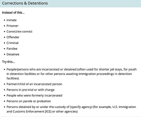 Another group of words what are now wrong-speak is how people who are incarcerated are to be discussed: