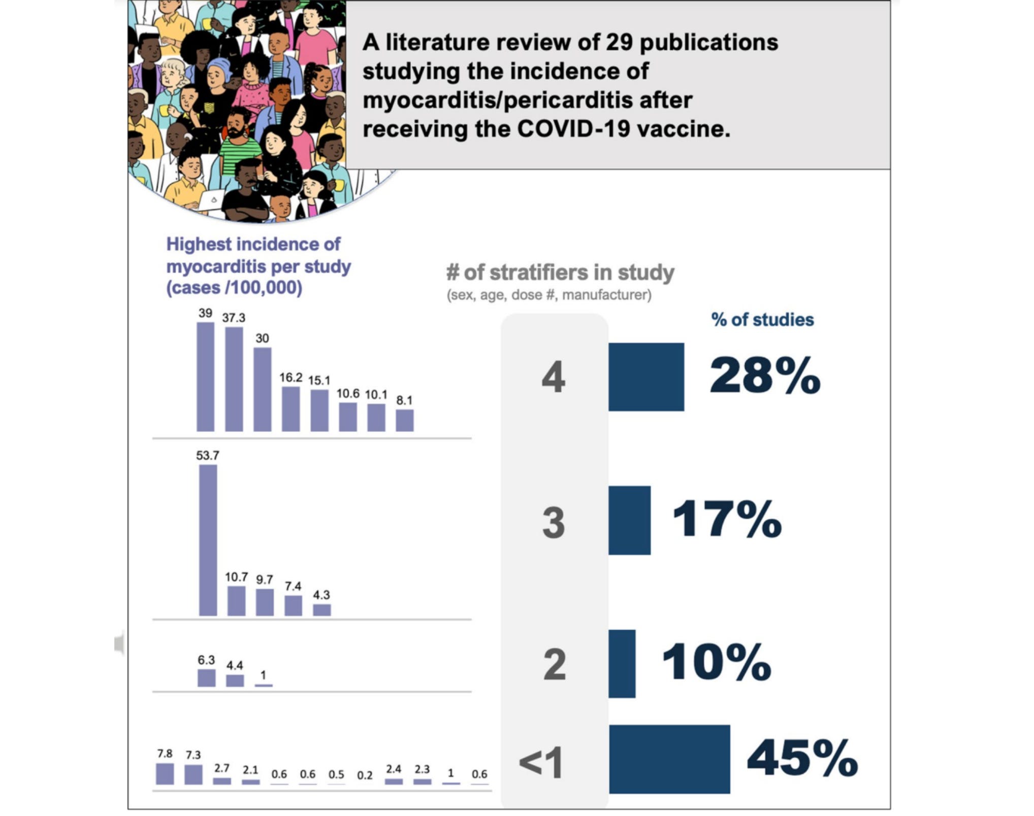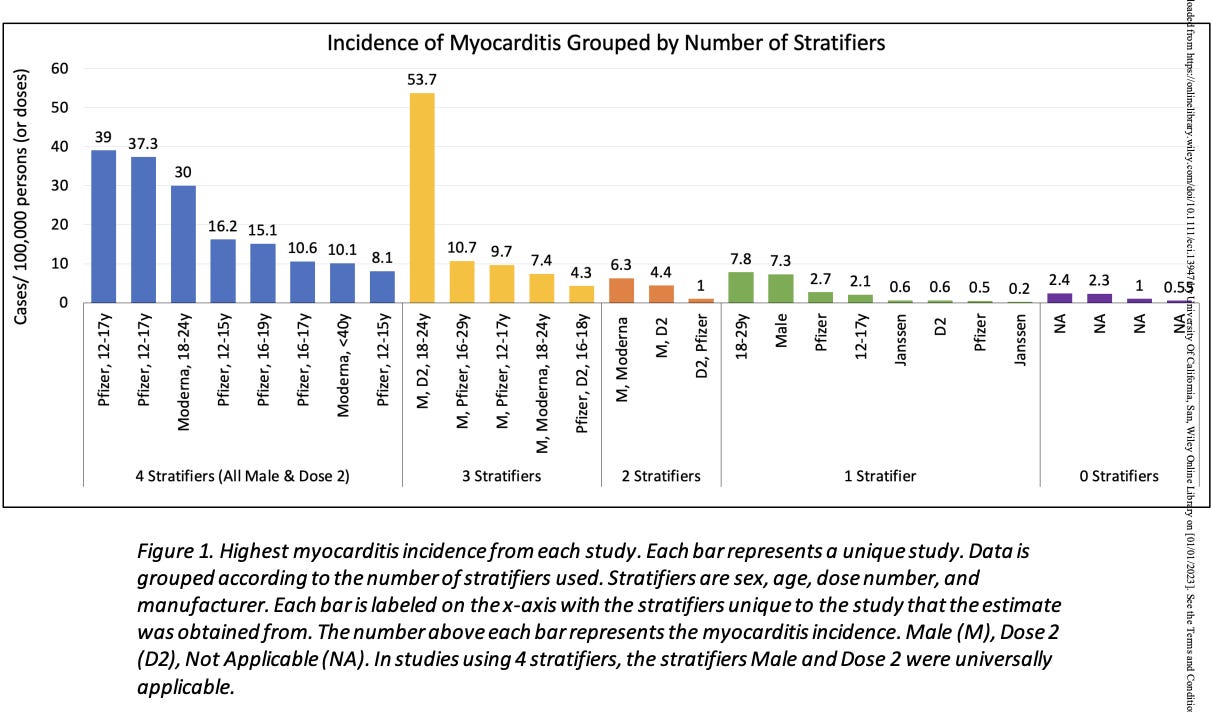 In our paper, we prove something interesting. If you look at all the analyses of myocarditis post vaccine, some researchers breakdown results by age, sex, product and dose. (4 stratifiers), while others lump 20 year old men with 80 year old women (<=1 stratifier). And many inbetween.
