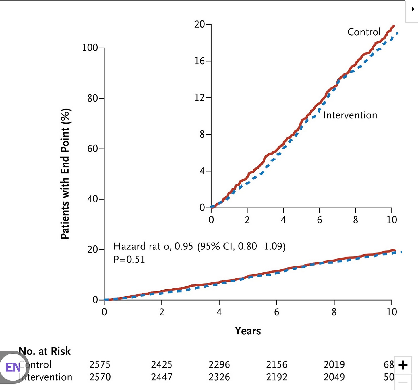 Of course, the primary endpoint was composite cardiovascular events, and that was… totally null. Just superimposable curves