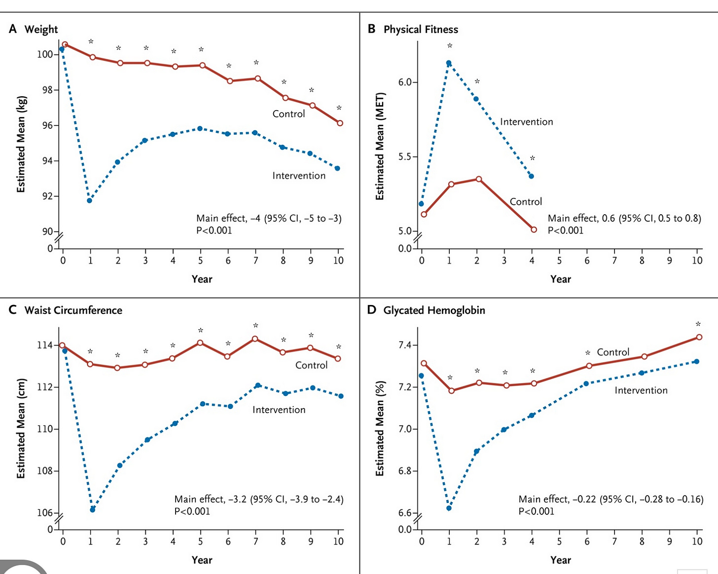 Why do I feel this way. Consider the massive NIH study Look Ahead. It randomized high risk, obese type 2 diabetes to intensive diet and exercise. And across all surrogates it succeeded spectacularly.