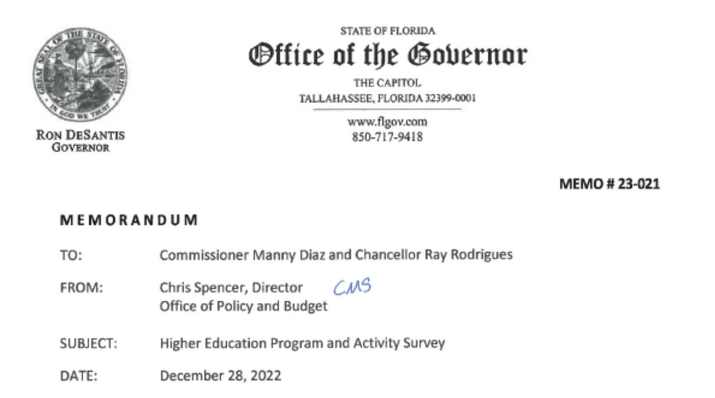 🔥 People ask me all the time if the universities are a lost cause. Well, I told you to strap in. Governor DeSantis’ Budget Director sent a memo to state officials last week, asking for a detailed accounting of money spent on “Diversity, Equity, and Inclusion” programs, along with lists of personnel employed in those areas. Uh oh!