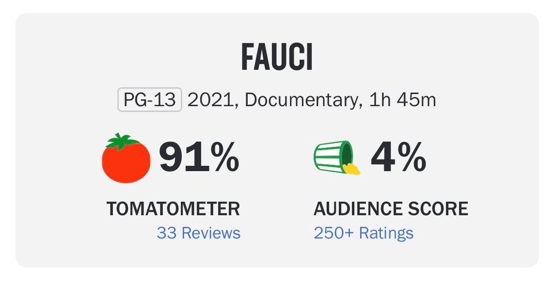 🔥 The audience score seems a little at odds with the reviewers on Rotten Tomato’s “Tomatometer” ratings for Fauci’s 2021 hagiographic biopic:
