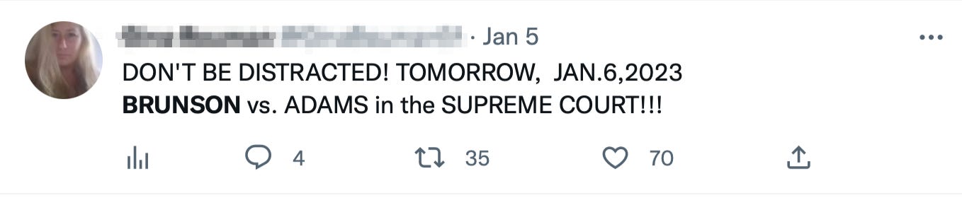 🔥 Today the Supreme Court will consider the case of Brunson v. Biden, which I reported about back on December 2nd, along with a lengthy list of other cases vying for Supreme Court certiorari. The case is on today’s calendar for a private conference vote by the Justices. It takes four Justices voting “yes” to move a case to the argument calendar. Very, very few cases pass that bar.
