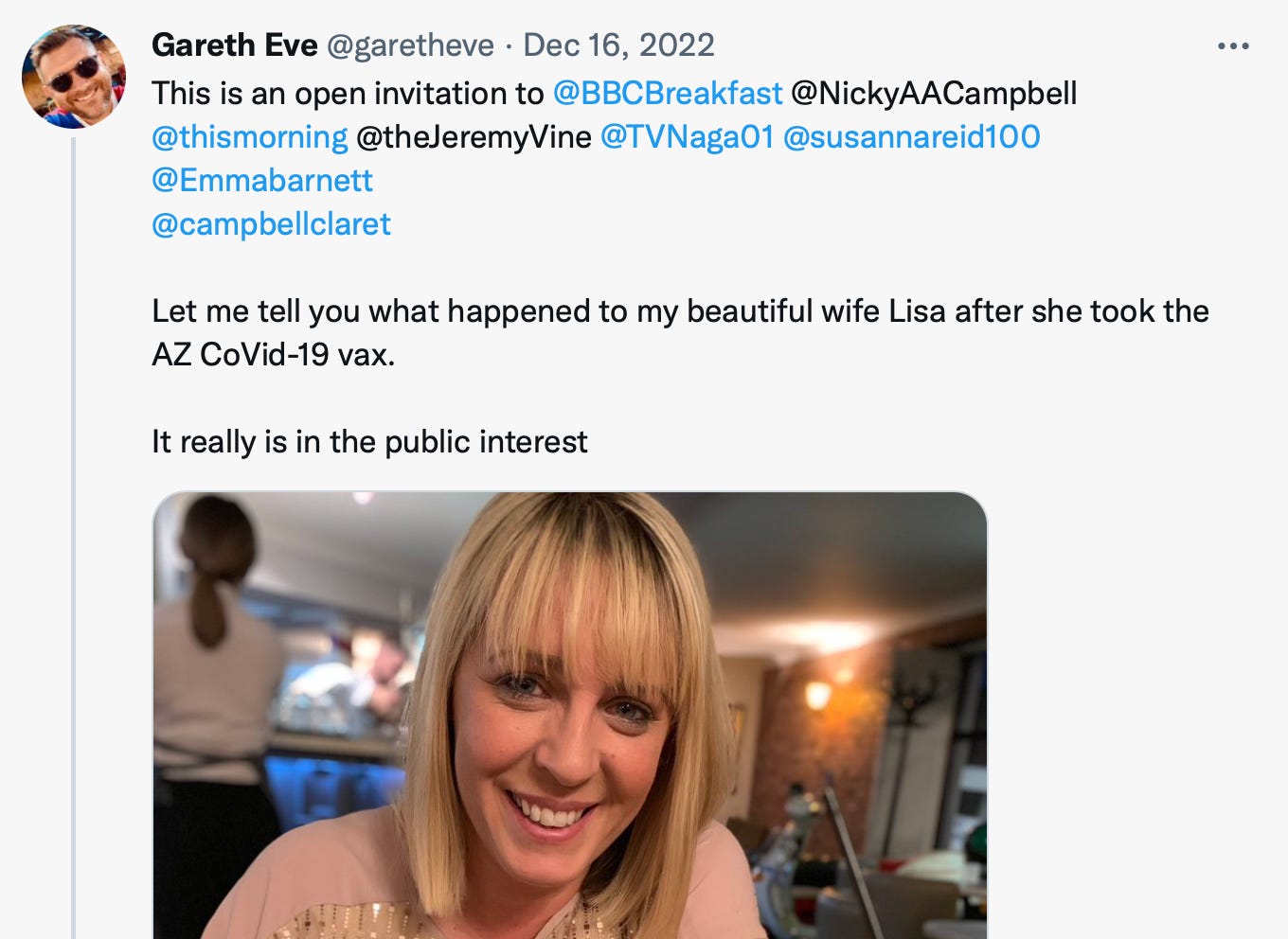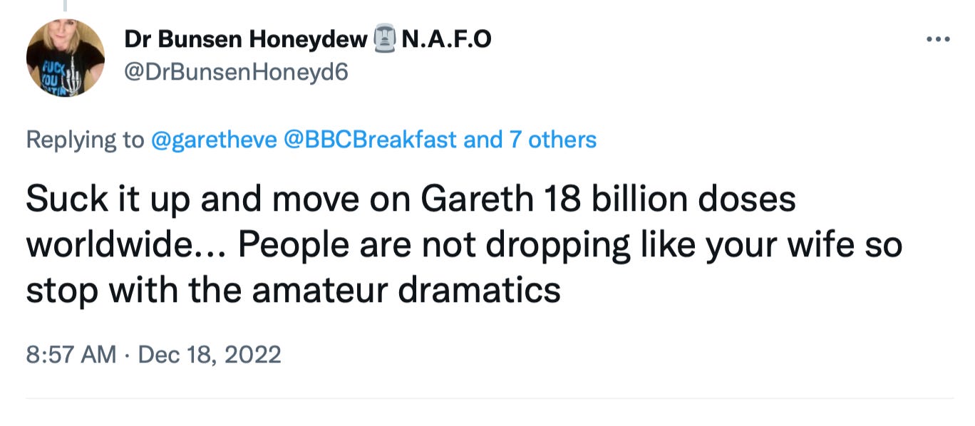 Dr. Honeydew’s beside manner is even more appalling than our other fake doctors. On December 16th, this unrelated widower Gareth tweeted about his dead wife, who died suddenly and unexpectedly after getting the jab: