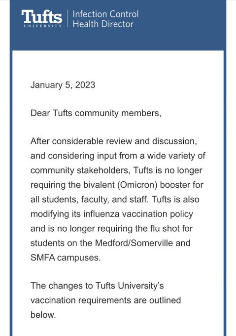 💉 Yesterday, Tufts University announced it is ending both its bivalent booster mandate as well as its flu vaccine mandate (in some locations). Tufts was one of the few colleges that mandated the bivalent booster.