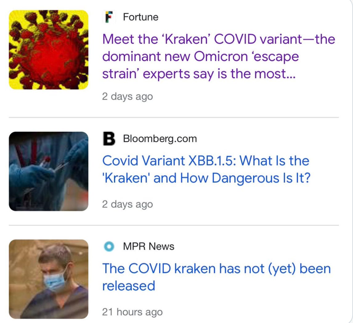Then over the last few days, corporate media has been valiantly efforting a salty new movement to brand the next variant with a more memorable name than a bunch of capital letters and numbers. Unfortunately, they may have overshot the mark — just a smidge — when they hysterically labeled it, “the Kraken.” I am not making that up.