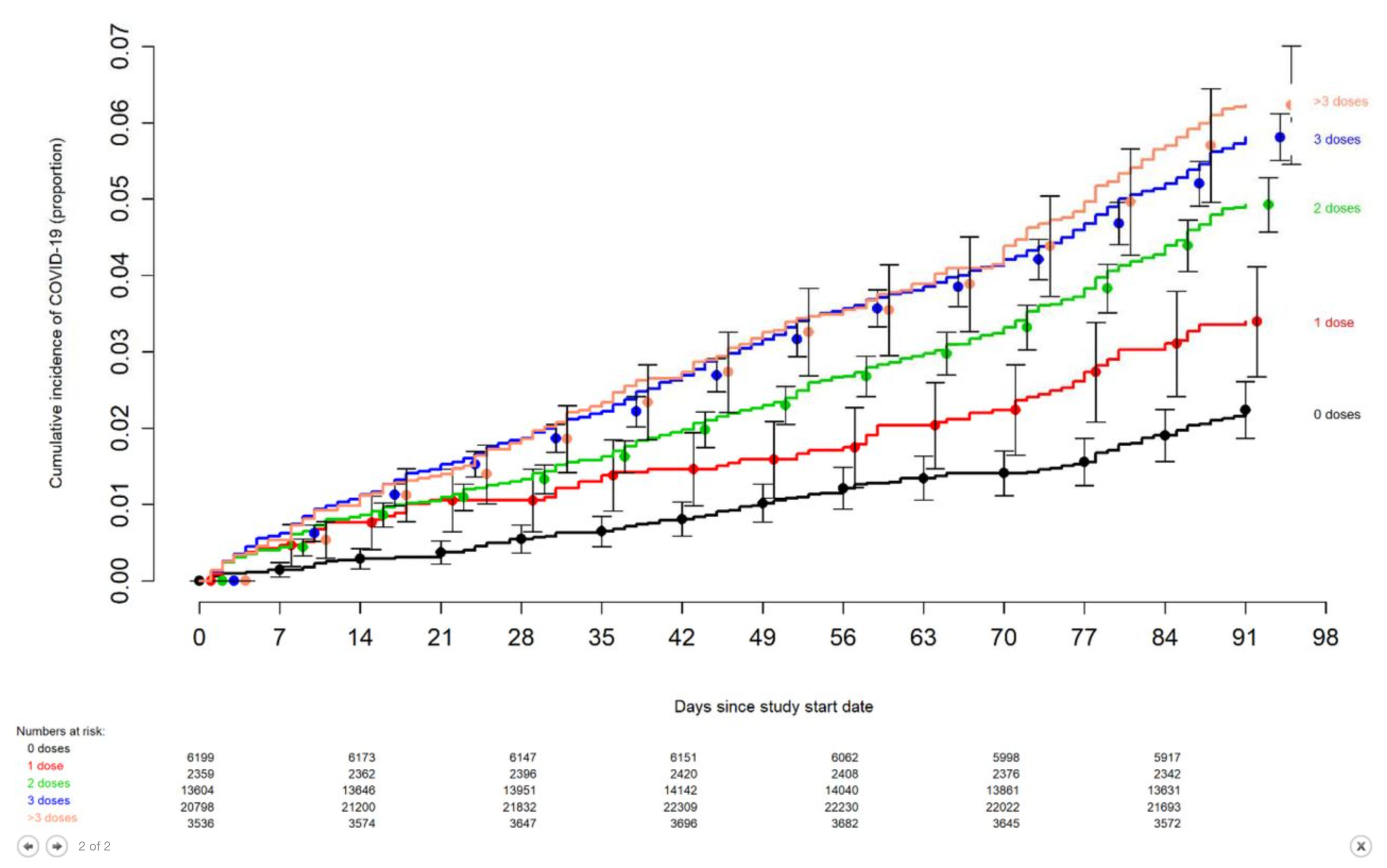 “The risk of COVID-19 also varied by the number of COVID-19 vaccine doses previously received. The higher the number of vaccines previously received, the higher the risk of contracting COVID-19 (Figure 2).”
