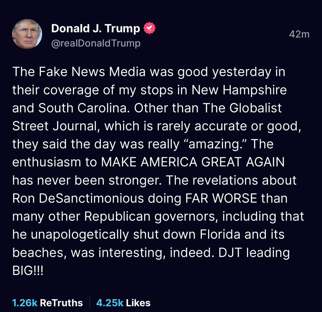 🔥 I usually don’t cover the “people said stuff” news, but every once in a while, there’s something noteworthy that compels a response about something somebody said. Yesterday, it was Trump, who posted a contentious note that on the surface seems like a silly fighting invitation offered to Governor DeSantis, presumably to create some media drama for the primary.