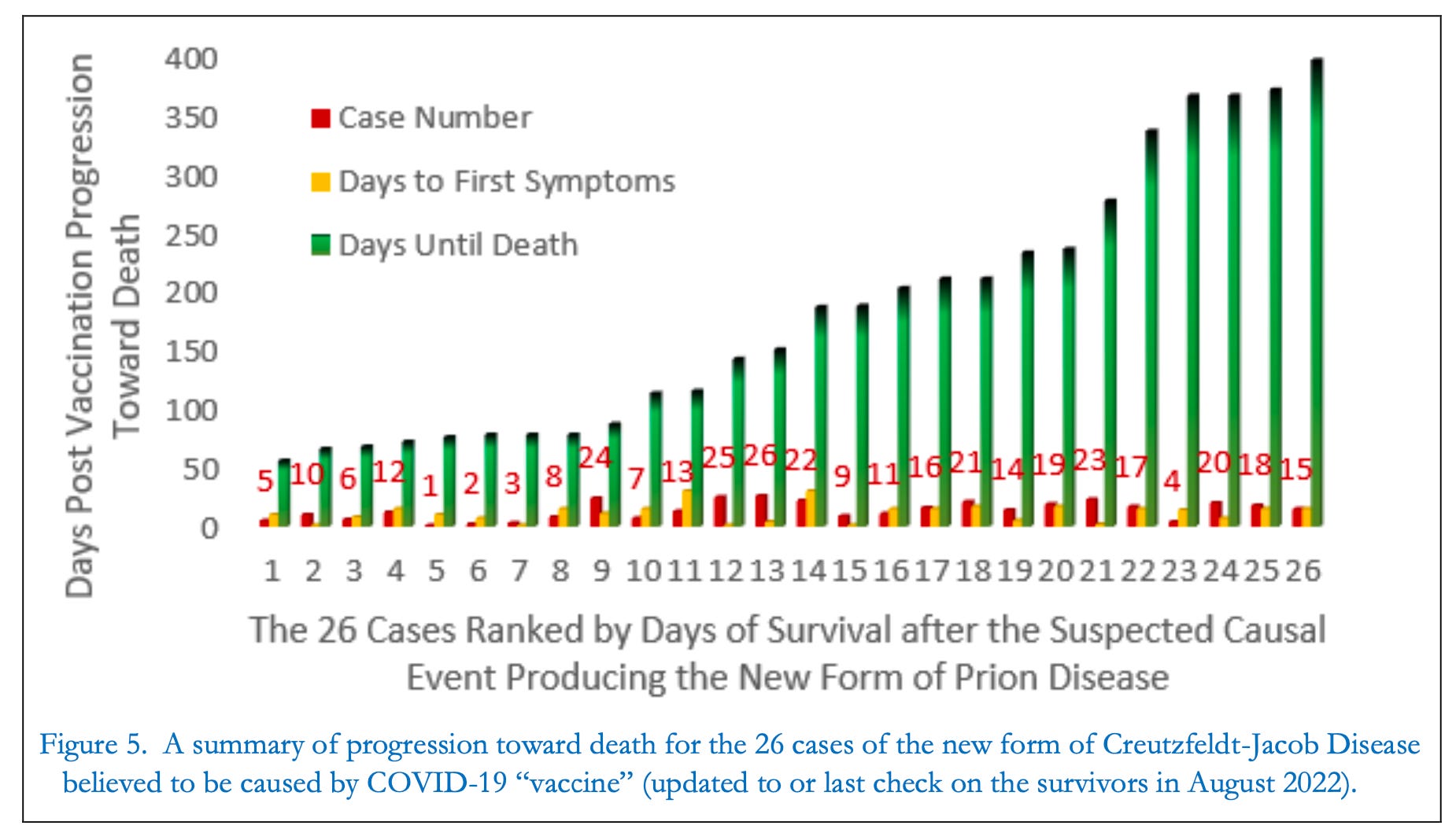 Only 28 cases of Creuzfeldt-Jacob Disease were diagnosed in France between 1992 and 2019… Here we expand on that record with all of the [recent] 26 cases that we began to analyze a few weeks before an additional 50 cases of rapidly developing Creutzfeldt-Jacob Disease appeared in France very soon after the injection of a first or second dose of the Pfizer or Moderna injectables… [For various reasons] it is highly probable that the real number of cases of the new form of Creutzfeldt-Jacob Disease is greater than any European agency (or any other authority) has reported…