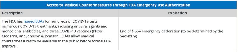 - A separate emergency declaration pursuant to Section 564 of the Federal Food, Drug, and Cosmetic (FD&C) Act was issued by the Secretary of HHS in February 2020. Based on this determination, on March 27, 2020, the Secretary declared that circumstances existed to justify emergency use authorization (EUA) of medical countermeasures for COVID-19. An EUA is a mechanism to facilitate availability and use of medical countermeasures that are determined to be safe and effective but have not yet been formally approved. An emergency declaration issued pursuant to Section 564 of the FD&C Act remains in effect until terminated by the HHS Secretary. The timing to conclude the EUA is to be determined; it will not conclude on May 11, 2023, with the other declarations.