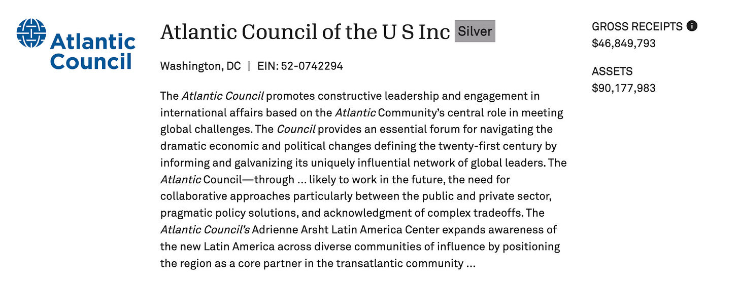 Note that the Atlantic Council’s gross receipts top 46 million a year, and they hold assets of over 90 million US dollars.