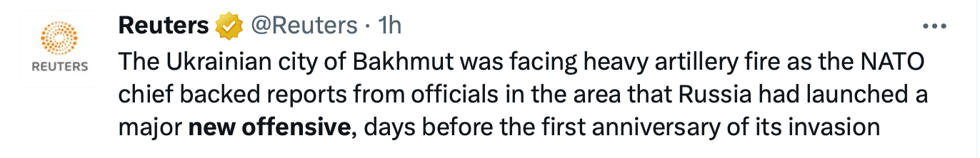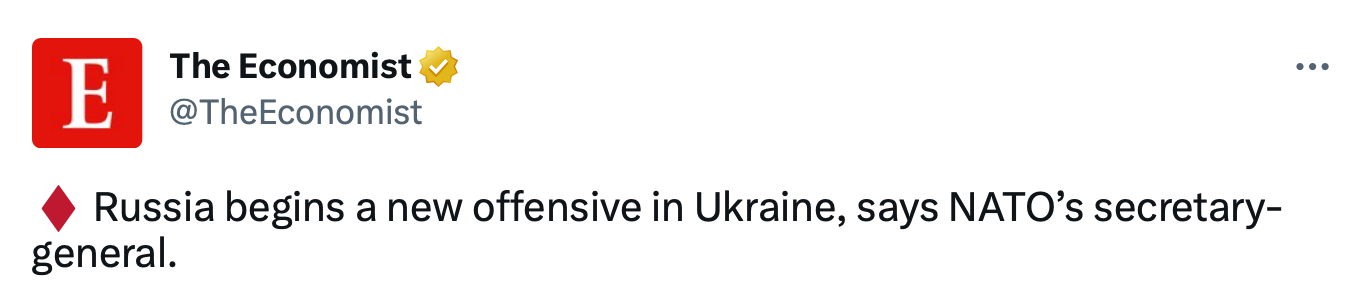For some reason, Reuters edited the story later in the day to remove the reference to Russia’s new offensive. But early this morning, the Economist tweeted a promo for its “World in Brief” column leading with an announcement of … a new Russian offensive.
