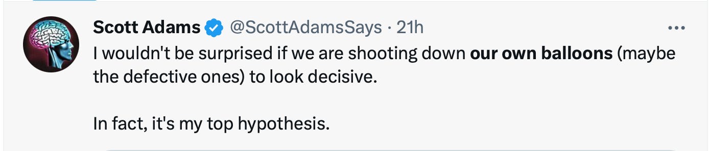 So, I don’t know about you, but I’m not going to invest a much more cognitive effort into the government’s goofy “unidentified object” story. I’m much more interested in why we let the Chinese spy blimp track our nuclear sites, and whether Supreme Proxy-War Commander Biden is dragging us into a hot world war, not to mention Nord-gate, East Palestine, and Hunter’s laptop.