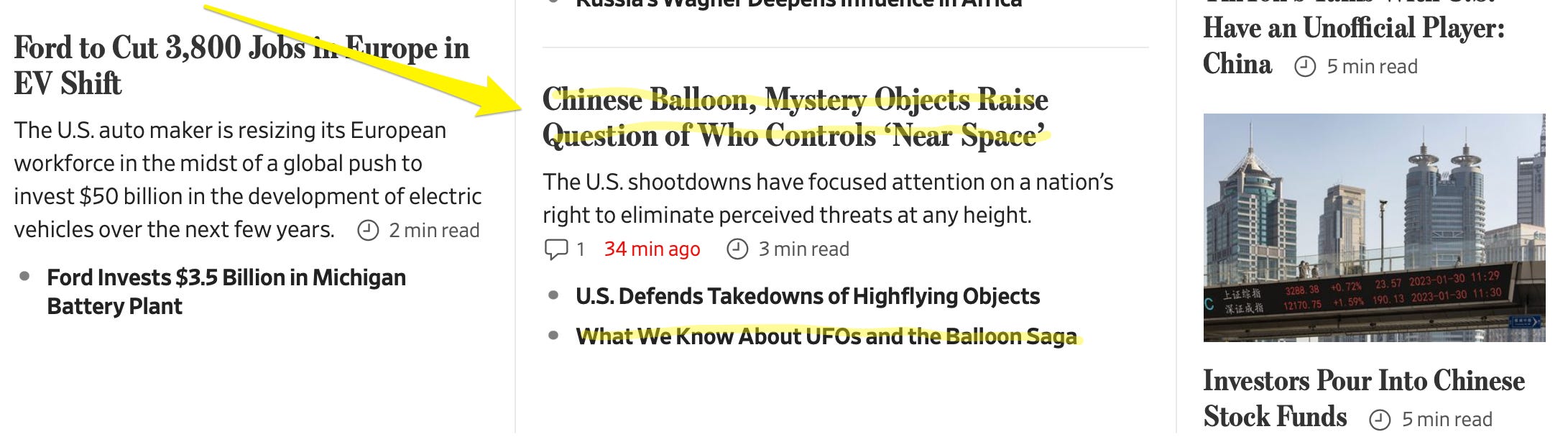Although the Wall Street Journal’s home page still says nothing at all about the East Palestine chemical disaster, or the new Russian offensive, it does contain a prominent story about the unidentified objects, and even includes a sub-headline reference to UFOs: