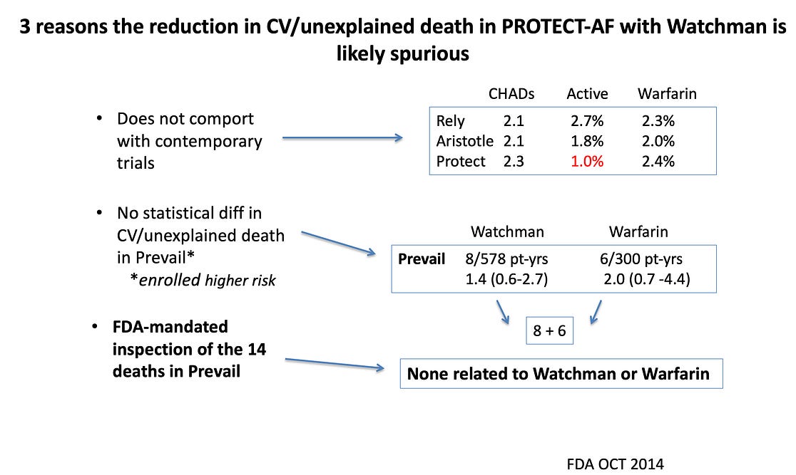 — In the seminal trials of appendage closure vs warfarin, the first trial (PROTECT AF) reported a striking reduction in death due to cardiovascular causes in the device arm. FDA seemed surprised by that and in the second trial (PREVAIL), they mandated inspection of all deaths that occurred in that second trial. They found that none of the deaths were related to either the device or anticoagulation. IOW: it was all noise. See slide: