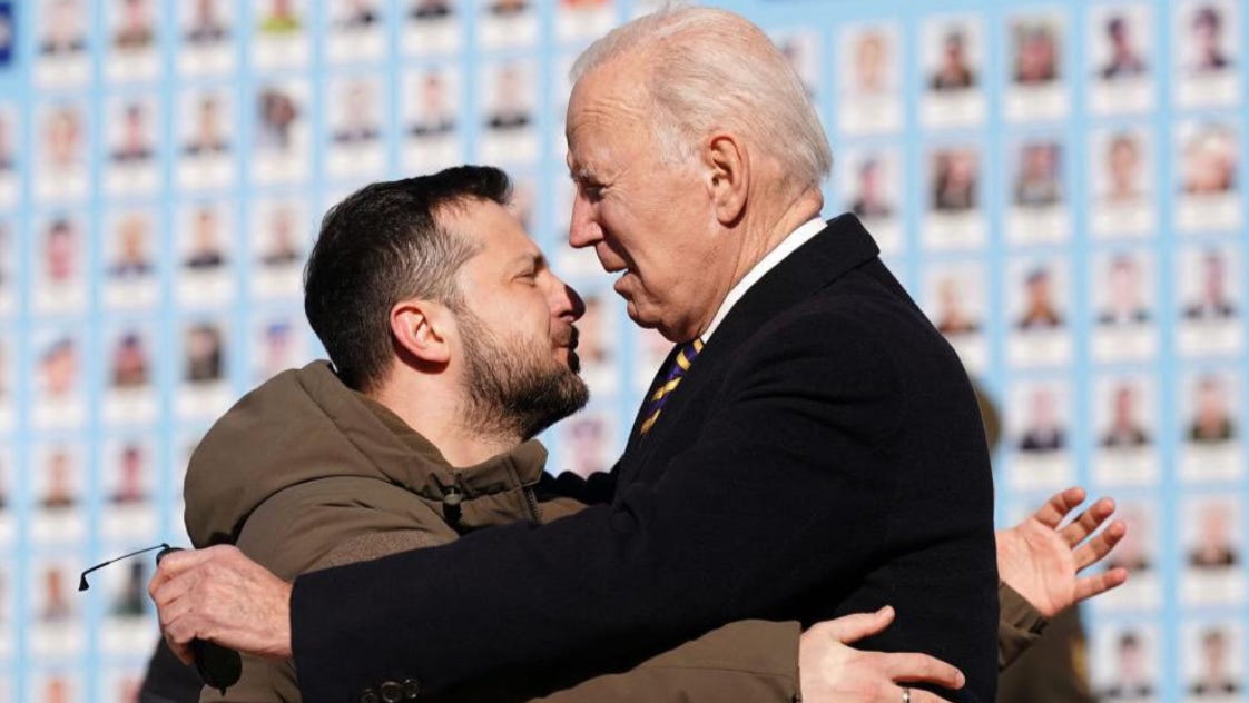 🚀 For the first time since occupying the White House, Joe Biden is in Kiev today to show support for the war effort or something and hand over another $500 million dollars collected from American taxpayers. Observe the definitive awkward embrace, and consider what it represents metaphorically.