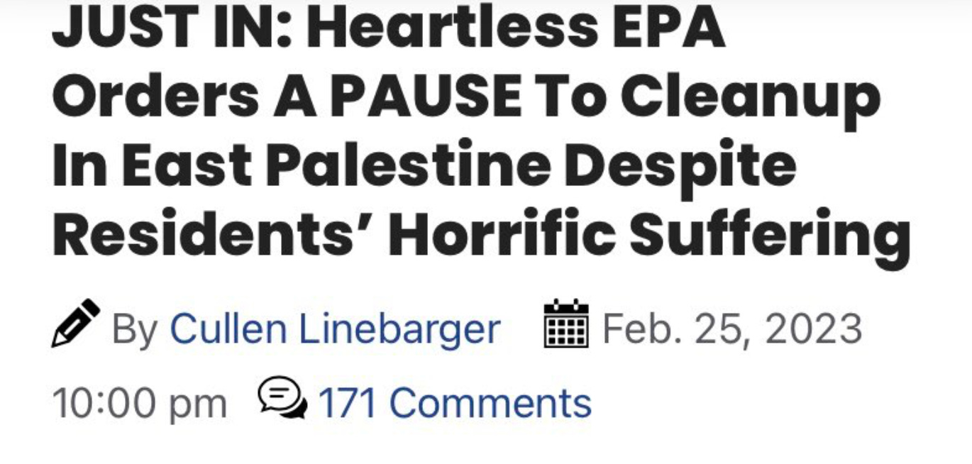 🔥 National Review ran an alarming article yesterday headlined, “EPA Orders Pause of Toxic-Waste Removal from Site of Ohio Train Derailment.” The pause started Saturday, it was un-paused yesterday afternoon, and the reason for the pause was pretty ironic.