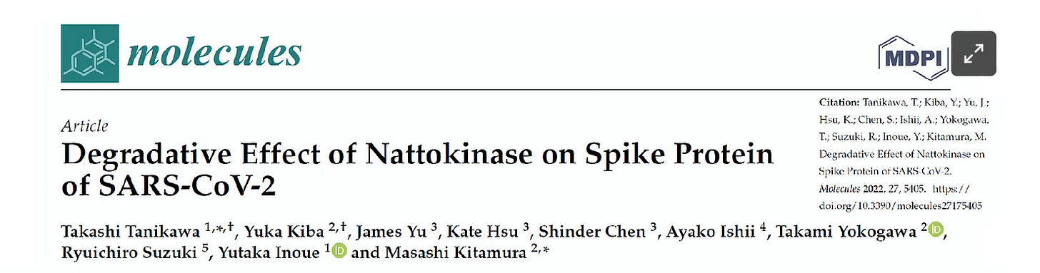 Nattokinase will not completely solve the vaccine injury problem, but it is the best-evidenced potential prophylactic I’ve seen so far (out of a number of promising candidates). I will update you whenever I come across anything else showing evidence of a beneficial effect.