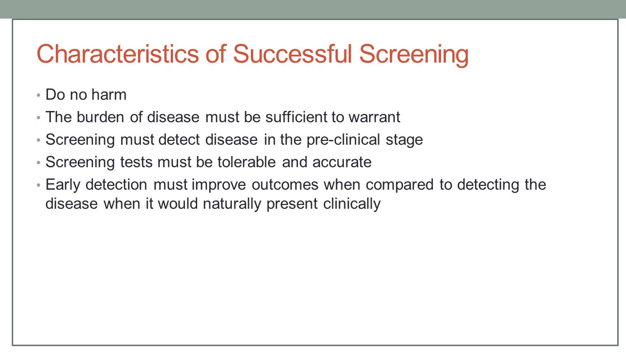 A screening test is meant to find a disease in a person who has no symptoms. The intent of screening is to improve outcomes for the person, improved as compared to the outcome he would have had if you waited for him to develop symptoms.
