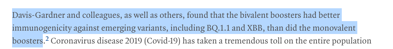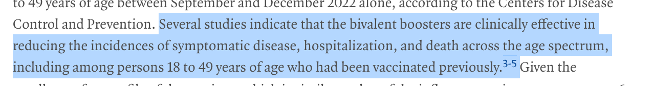 One study is only >65 years old and up, which is not the topic of debate. One is a criminally stupid study that compares bivalent boosters to a group that includes people who got the original 2 doses but no 3rd dose. But bivalent boosters are nearly exclusively given to people who got 2 original doses AND a 3rd dose. Paul Offit concedes a transient reduction in symptomatic sars-cov-2, but argues this will wain with time, but I don’t concede that b/c the method cannot correct for bias. Only RCTs could show that.