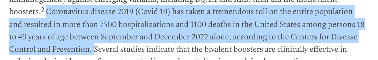 This is not evidence for boosters now, but a summary of what happened in the past (using inaccurate data, no less). The forthcoming risk to young people 18-49 is lower than in the past. More people have had COVID now. The question is do 18-49 year olds benefit in the future? The fact the past had 7500 hospitalizations (PS you haven’t removed incidental hospitalizations) is not about the present, and a cheap emotional argument.