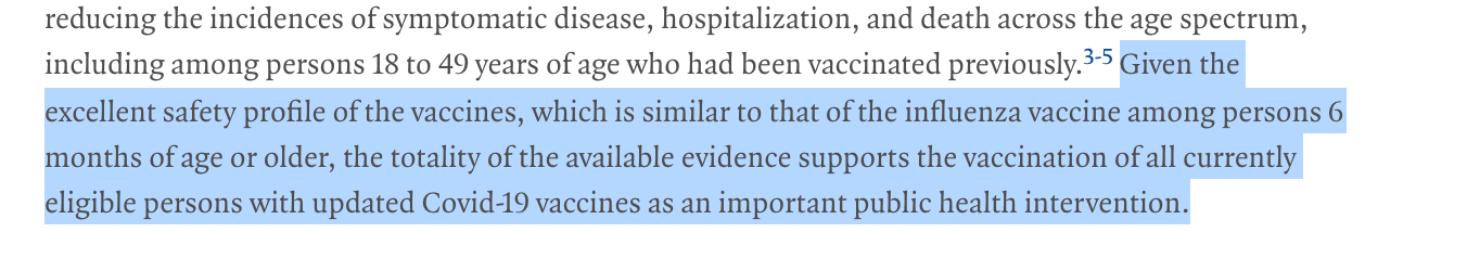 The last sentence is particularly problematic. Of course, myocarditis in boys aged 16-24, will be seen with bivalent boosters, and has been seen with monovalent boosting, and is not like influenza vaccines at all. Get out of here.