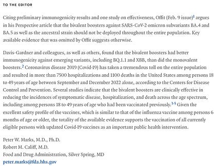 In response to Paul Offit’s NEJM editorial Peter Marks and Robert Califf from FDA have a reply that argues— falsely— that good evidence shows boosters benefit young people. I am going to dismantle their argument, sentence by sentence.