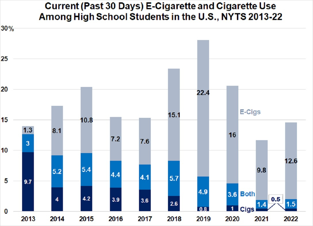 As for teen vaping in 2022, 14.1 percent of high school students used an e-cigarette at least once in the last month (12.6 percent use only e-cigarettes, 1.5 use both cigarettes and e-cigarettes) and 4.2 percent of high school students use daily. (NB: CDC data show that 30.1 percent of high school vapers (14.1 of all high schoolers) use daily. 30.1 percent of 14.1 percent = 4.2)