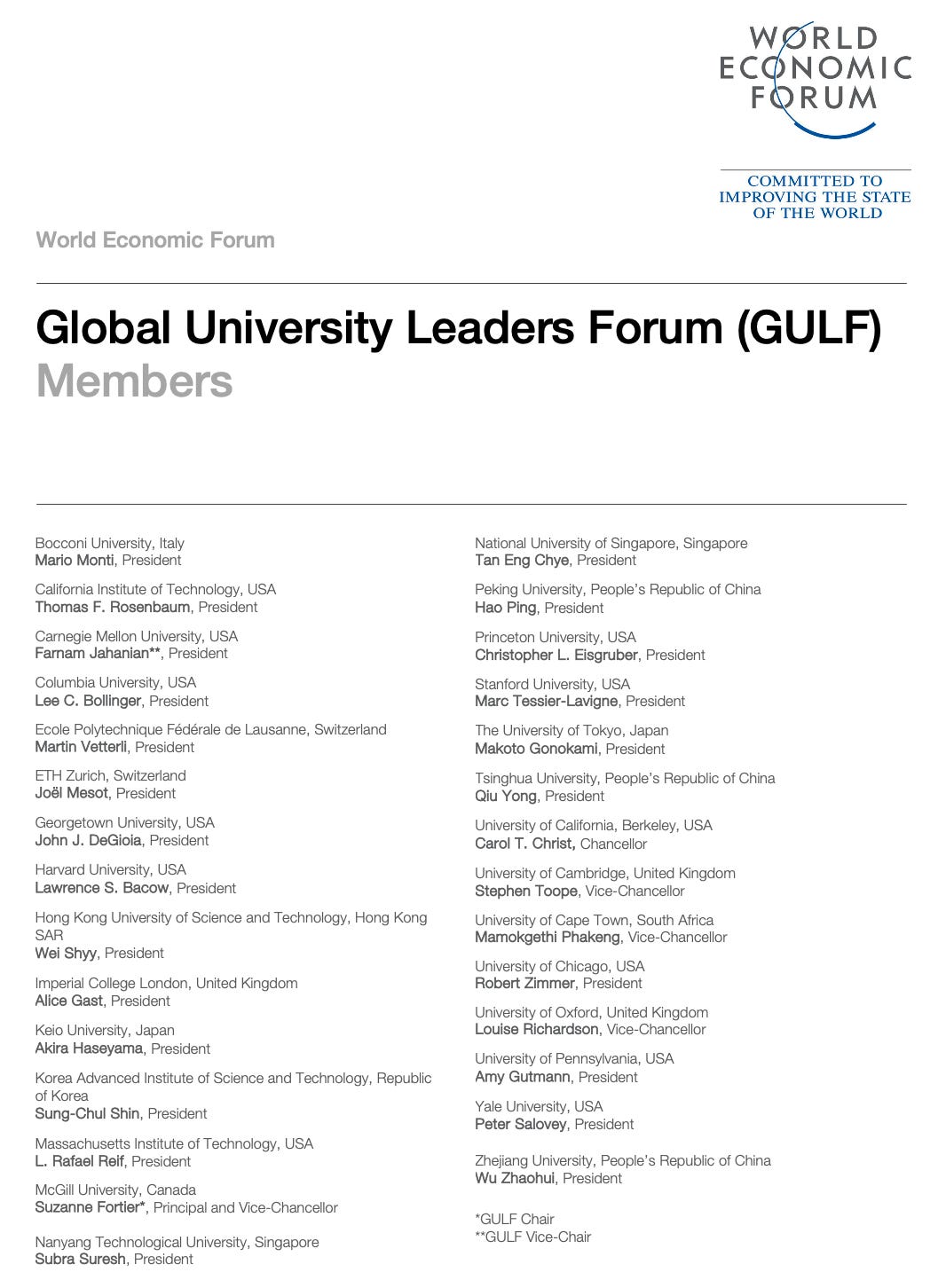 The Global University Leaders Forum (GULF) community consists of the presidents of the world’s leading universities who are committed to supporting the Forum’s mission of improving the state of the world. Together GULF presidents identify and address matters of common interest, including trends, challenges and best practices in higher education, research and societal impact. The community is comprised of 29 members and is chaired by Suzanne Fortier, Principal and Vice-Chancellor, McGill University.