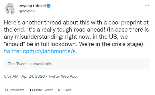 Zeynep’s indifference to harms during the response to COVID wasn’t limited to masking. Though the policy had no precedent in the modern western world until Xi Jinping’s lockdown of Wuhan and wasn’t part of any democratic country’s pandemic plan, in a since-deleted tweet, Zeynep argued that the United States “should be in full lockdown” in spring 2020.