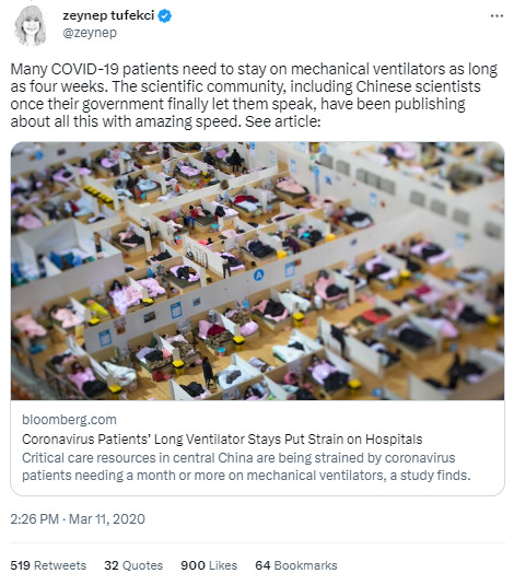 For example, Zeynep advocated for increased ventilator use in early March 2020 based on information from Chinese scientists, noting in a widely-shared tweet that “Chinese scientists” had advised “many COVID-19 patients need to stay on mechanical ventilators as long as four weeks.”
