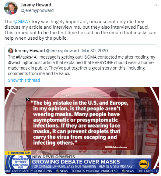 This emphasis on “droplets” is later reiterated in Howard’s falsely-titled article To help stop coronavirus, everyone should be wearing face masks. The science is clear in the Guardian, as well as Zeynep and Howard’s article Don’t Wear a Mask for Yourself in the Atlantic. Howard then went on a media blitz similar to that of Tomás Pueyo, and he was booked on ABC’s Good Morning America.