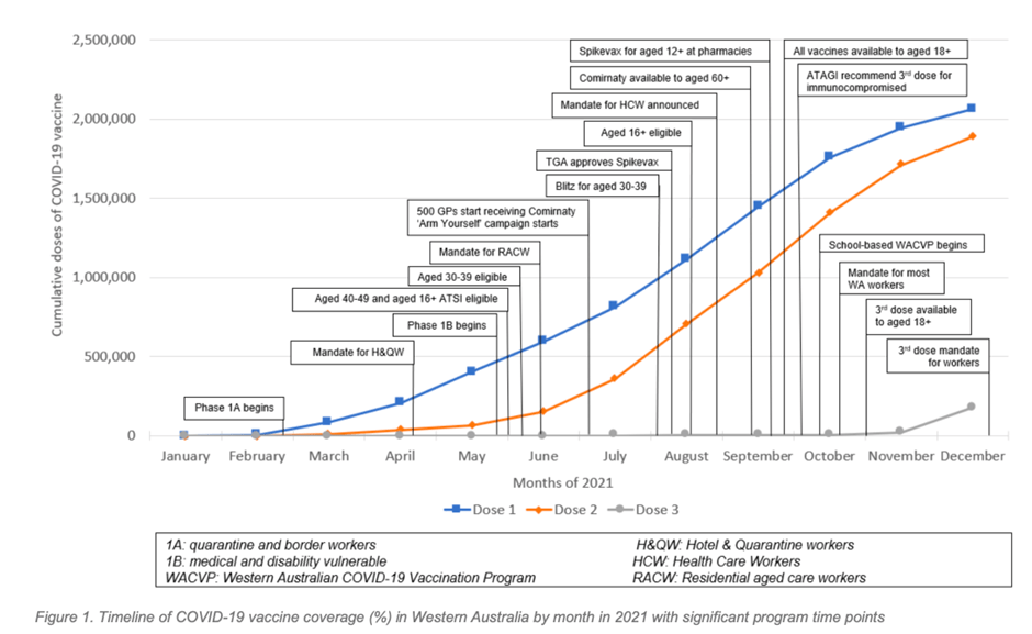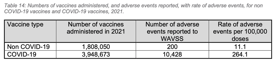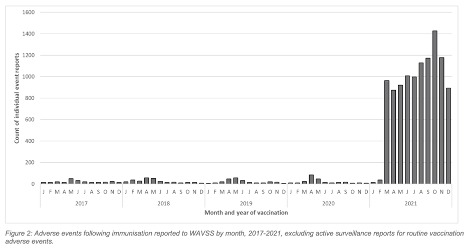 From the report, “The number of adverse events following immunisation (AEFI) reported to Western Australia Vaccine Safety Surveillance (WAVSS) was significantly higher in 2021 than in previous years… due to the introduction of the COVID-19 vaccination program.”