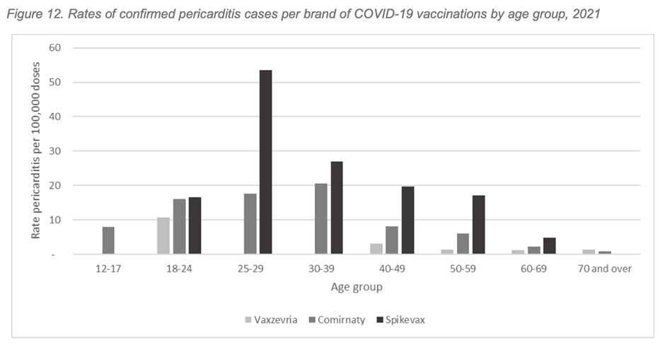 A standout finding from the report is that background rates of myocarditis and pericarditis increased by 35% and 25%, respectively. Reported rates of both conditions following vaccination with Moderna’s Spikevax and Pfizer’s Comirnaty were much higher than national rates reported by the TGA in the same period. Shockingly, the risk of pericarditis in the age group in the age group 25-29 years old was 53.5 cases per 100,000 doses of Spikevax. It is perhaps unsurprising that chest pain was the fifth most common reported AEFI for Covid vaccines in 2021.