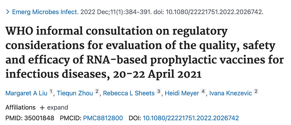 As I wrote about last year, there was a World Health Organization (WHO) consultation in April, 2021 whereby US government officials laid out strategies for the process of future mRNA vaccine approvals by the FDA.