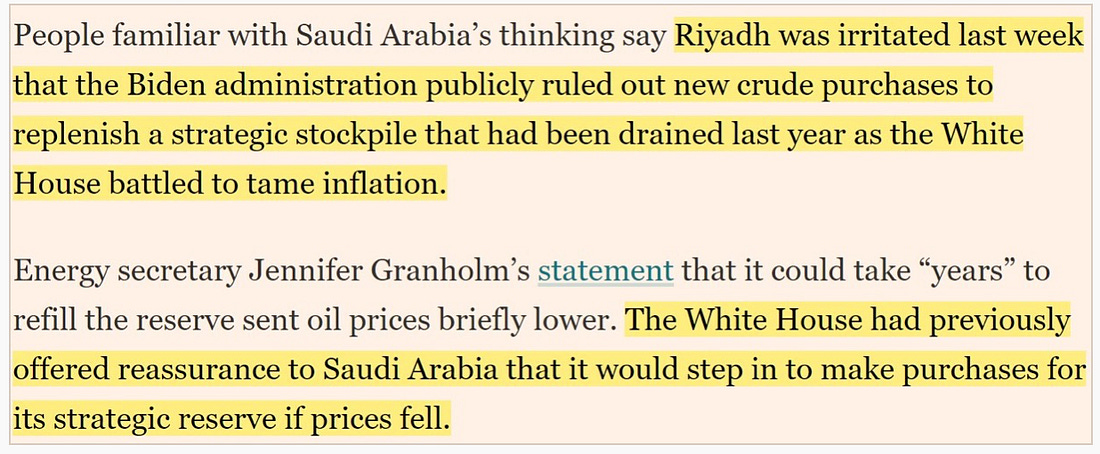 Saudi Arabia, the world’s largest oil producer, which Joe Biden just drove into the arms of the Russia-China axis, announced surprise production cuts totaling up to 1.6 million barrels per day for the rest of the year, a move that the AP drily noted “could raise prices worldwide.”