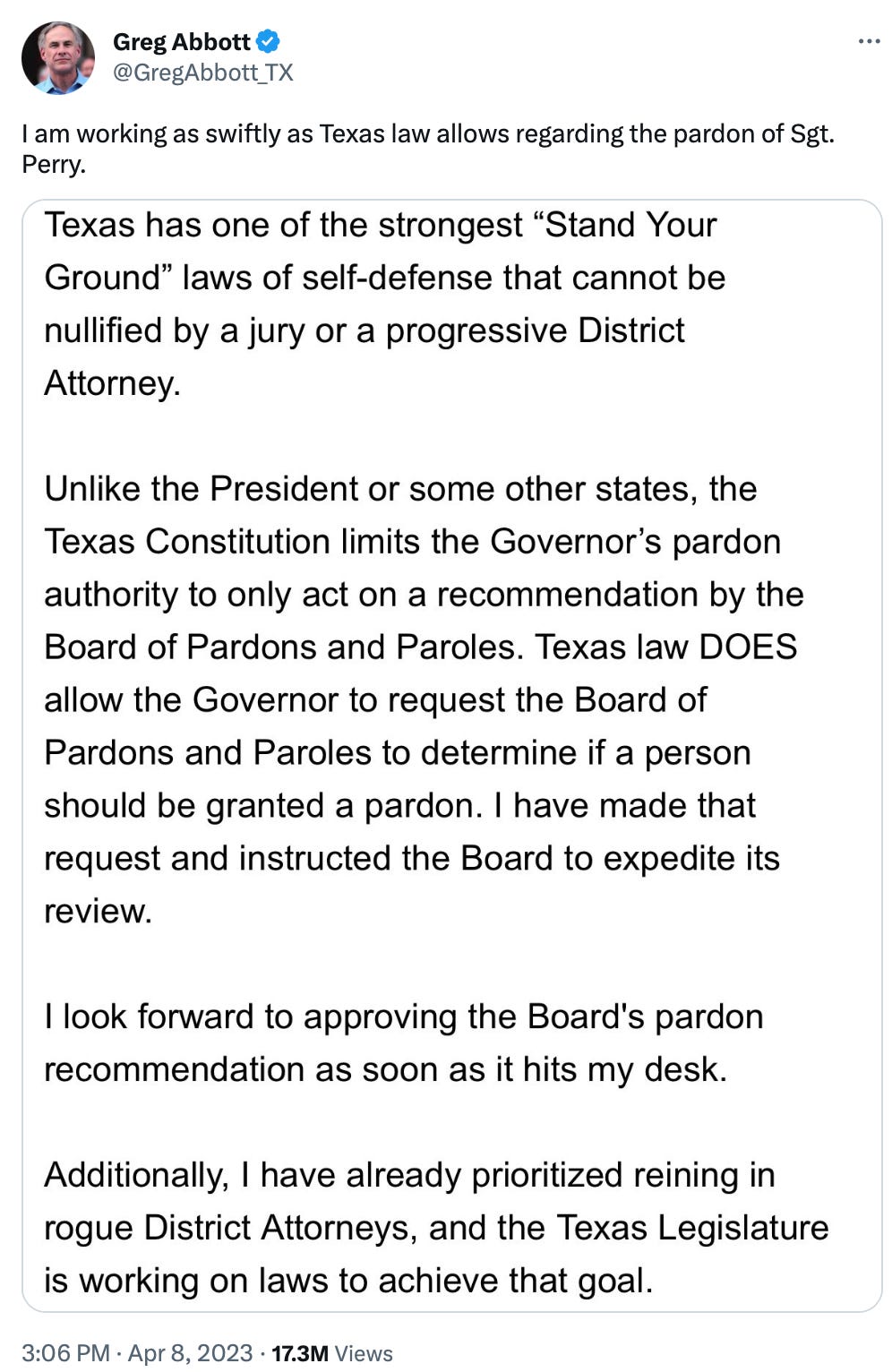On Saturday, Texas Governor Greg Abbott issued a statement saying he intended to pardon Perry as soon as the Board of Pardons completes its review (assuming the Board recommends a pardon).