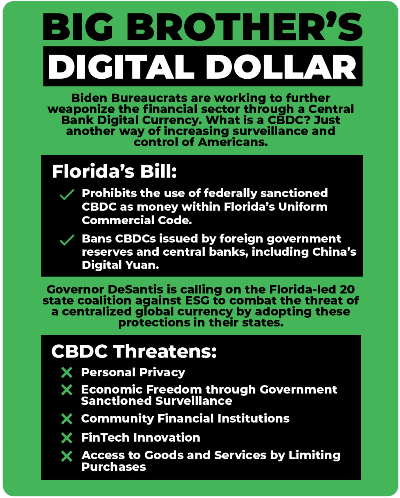 🔥 Florida Governor Ron DeSantis held another press conference this week announcing a new package of proposed laws intended to hamstring any Central Bank Digital Currency. DeSantis also called on other red states to adopt similar laws. Here’s the Governor’s descriptive flyer about the bill: