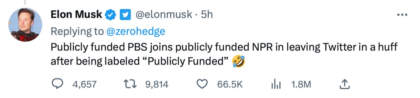 NPR and PBS rage-quit Twitter yesterday after being accurately labeled as “Government-Funded.” Twitter owner Elon Musk seemed more amused than punished: