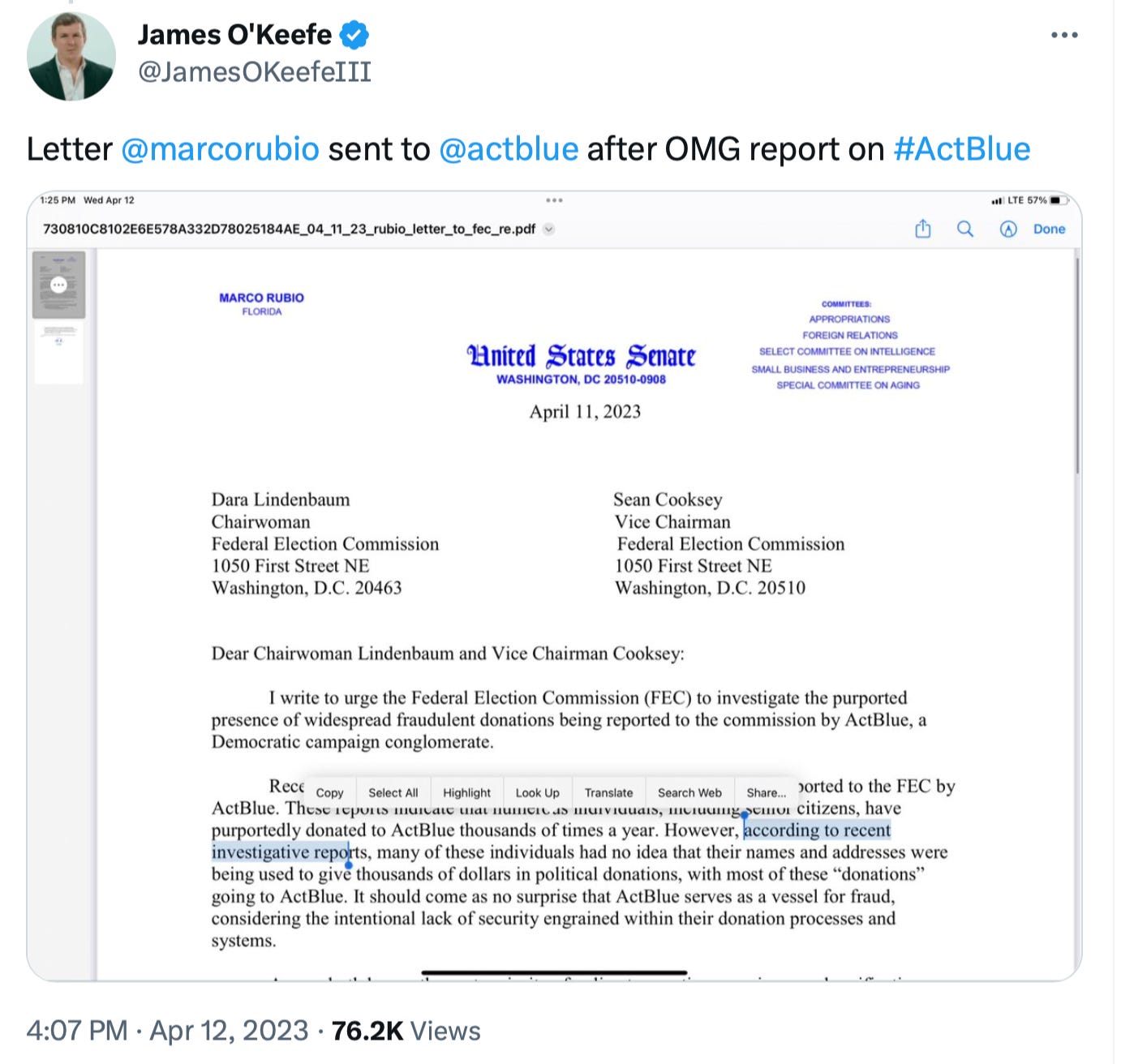 🔥 James O’Keefe’s ActBlue exposé continues to bear fruit, as Florida Representative Marco Rubio sent a strongly-worded demand letter to the Federal Election Commission, demanding an investigation: