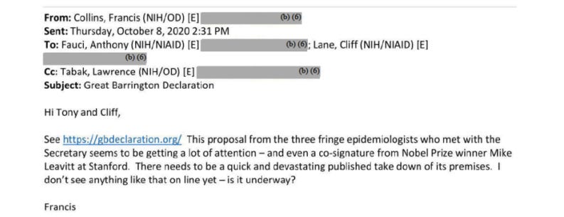 But former NIH director Francis Collins dismissed them as “fringe epidemiologists” asking Anthony Fauci for “a quick and devastating take down” of the declaration.
