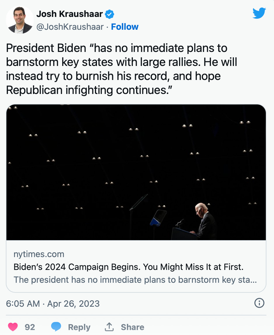 The New York Times ran a hilariously-titled story this week headlined, “Biden’s 2024 Campaign Begins. You Might Miss It At First.”