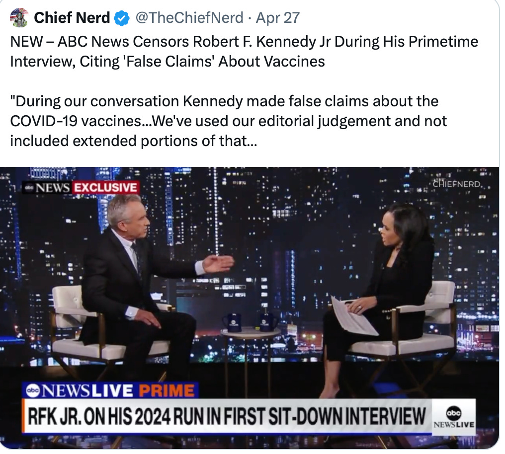 CBS aired an interview with RFK this week, but they cut the entire segment where he argued against the jabs. You probably think that’s outrageous censorship, but CBS was actually HELPING his campaign. A lot of dems would have been turned off hearing RFK run down the magic vaccines.