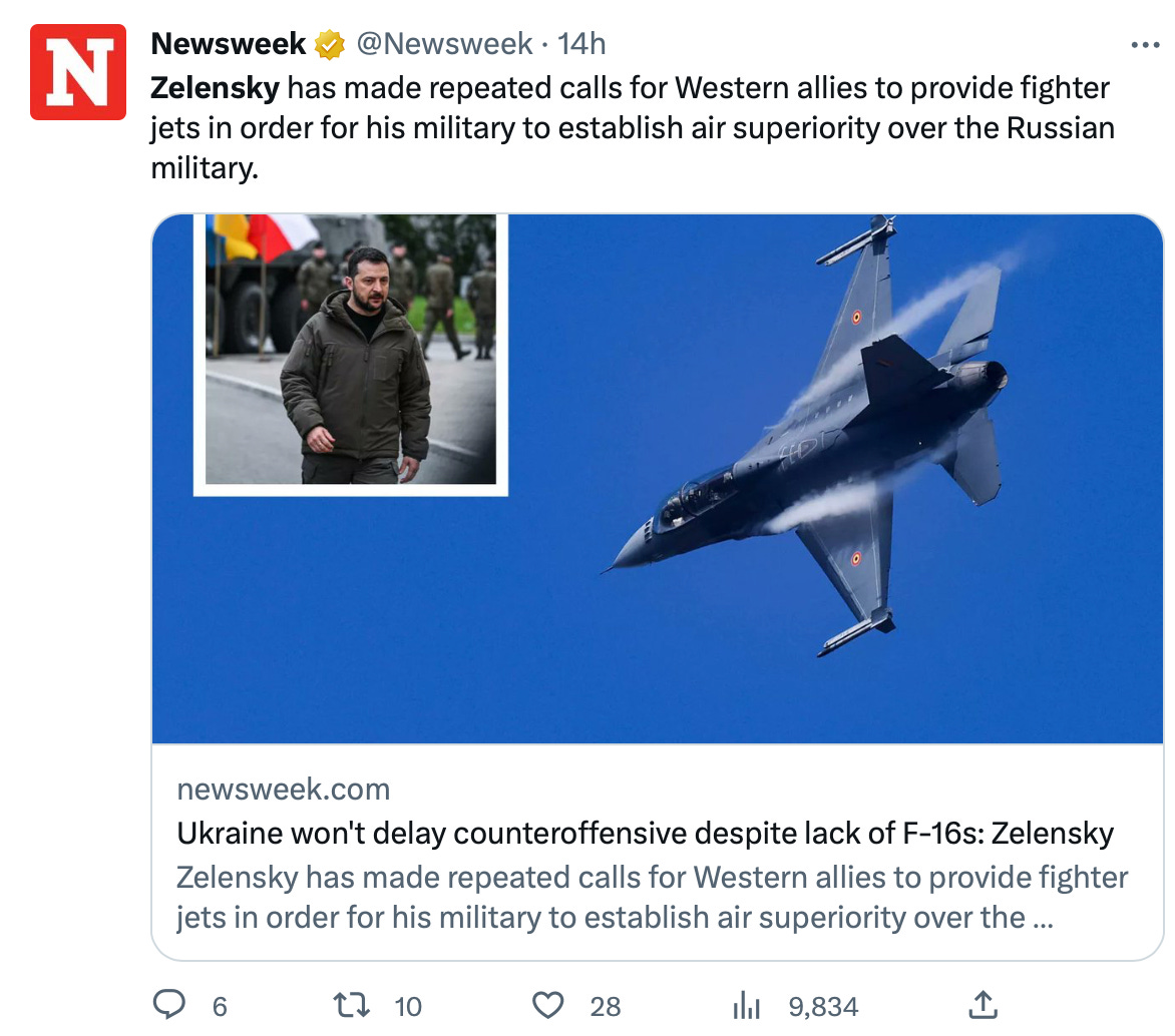 Similarly yesterday, Newsweek reported that President Zelensky told Ukrainians that the Spring Counter-Offensive would NOT wait after all, but would begin even without promised U.S. F-16 fighter jets — a deadline he previously had said was absolutely 100% required for the military action to commence: