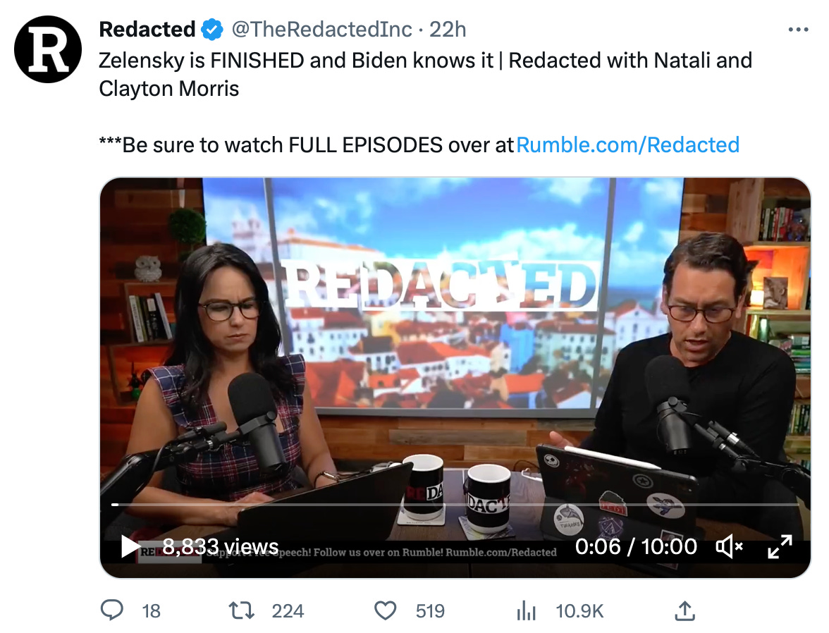 The Redacted clip included most of Joe Biden’s Tuesday gala re-election announcement video. And guess what’s missing from Biden’s campaign clip: ANY MENTION OF UKRAINE. Or even Putin, for that matter.