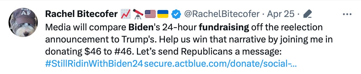 But “those close to Biden are worried they won’t have a big number to announce after the president formally launched his bid Tuesday morning,” Bloomberg reported, unironically noting “fundraising totals are a proxy for enthusiasm.”