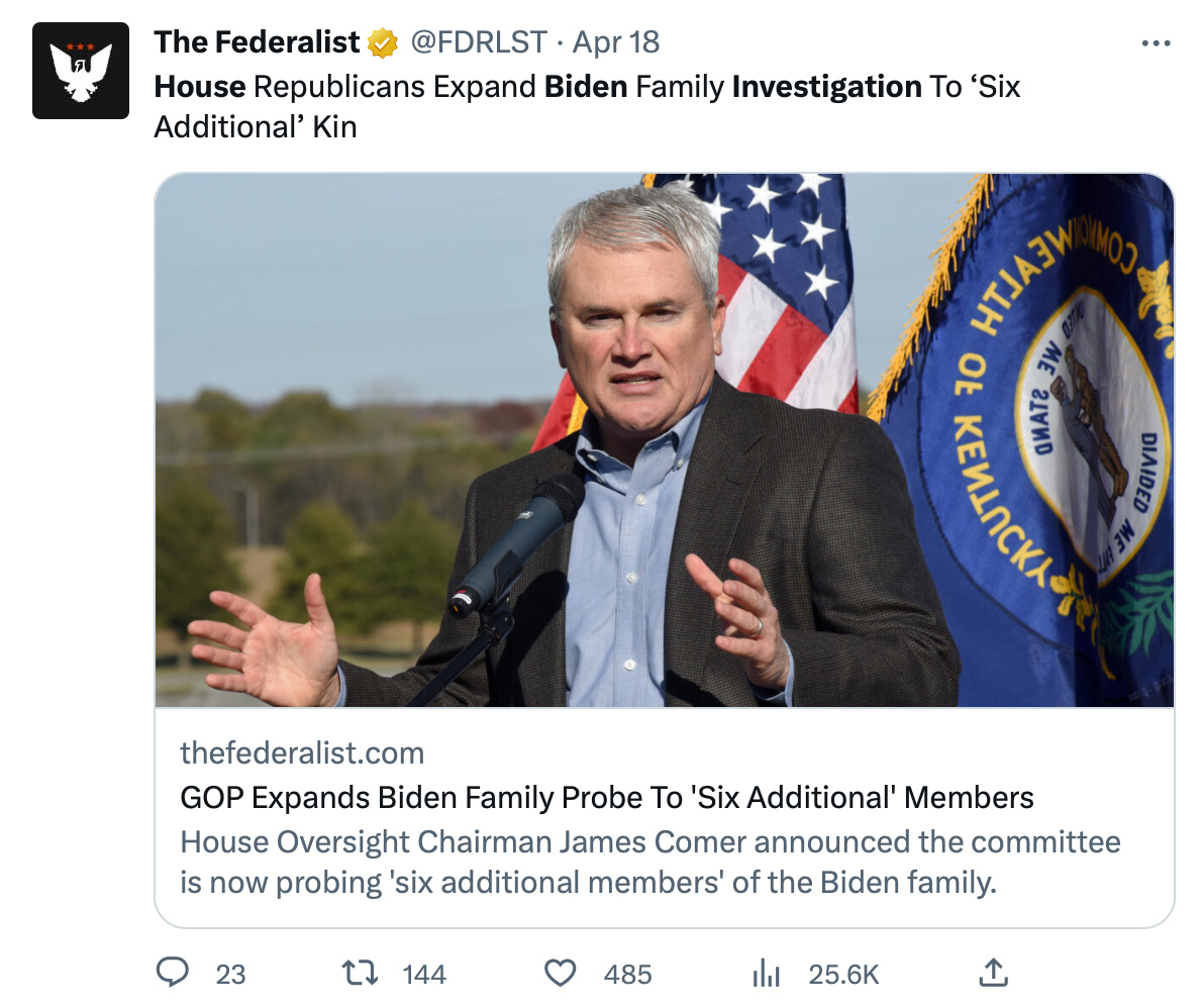 There are several other investigations underway, like into Biden’s FDA’s response to the baby formula shortage, his involvement in social media censorship, his ‘classified records in the garage’ problem, and more.