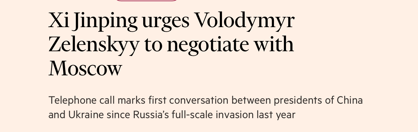 Two days later, the Financial Times reported that Zelensky had a “long and productive” phone call with President Xi of China, who encouraged peace talks: